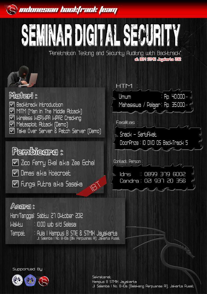 IBTeam bekerja sama dengan LP3I cabang kramat mengadakan seminar bertajuk “Beware Your Security !!! Nothing secure in this world”. Para pemateri yang waktu itu turun adalah James0baster, zee eichel, Habibi rizqi membawakan seminar ini baik sekali. Kami berharap agar pihak kampus dapat mengadakan acara positif di lain waktu. Beberapa live demo dengan menggunakan BackTrack operating system di tampilkan oleh para pembicara membuat suatu “real live simulation” membuat para peserta seminar ikut berinteraksi serta melihat langsung bagaimana seorang attacker menembus dan merusak jaringan dan data komputer.