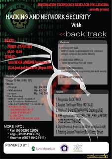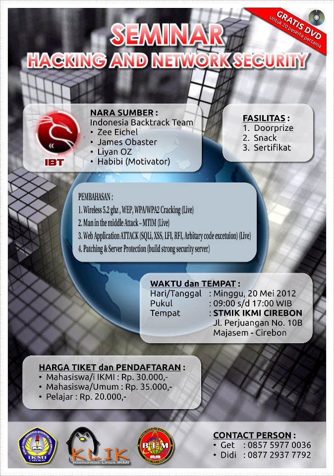 Karawang Jawa Barat , Seminar bertajuk “Hacking web attack & web security” yang di adakan oleh STMK Kharisma Karawang bekerja sama dengan Indonesian BackTrack Team ( IBTeam ) berjalan dengan baik. Tim pembicara yang waktu itu di turunkan adalah koecroet, zee eichel dan habibi berhasil membawakan materi dengan ruang lingkup keamanan aplikasi web. Real demo live web attack di bawakan oleh koecroet menarik minat para peserta untuk lebih mendalami BackTrack dan penetration testing.